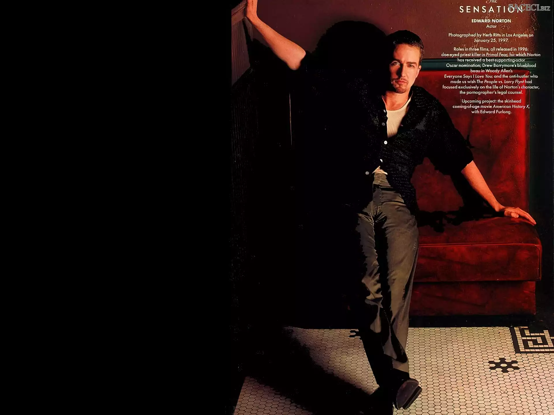 fotel, Edward Norton, czarna koszula - faceci.biz